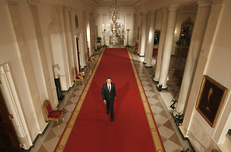 US President Barack Obama walks through the Cross Hall to the East Room for his first news conference as president at the White House in Washington, February 9, 2009. [Agencies]