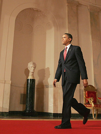 US President Barack Obama walks past a bust of former President Abraham Lincoln on his way to the East Room of the White House and his first news conference as president in Washington, February 9, 2009. [Agencies]
