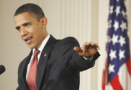 US President Barack Obama gestures during his first news conference as president in the East Room of the White House in Washington, February 9, 2009.[Agencies]
