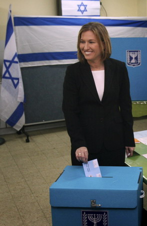 Israel's Foreign Minister Tzipi Livni casts her ballot for the parliamentary election at a polling station in Tel Aviv February 10, 2009. Livni led exit polls after Tuesday's parliamentary election by only a two-seat margin over right-winger Benjamin Netanyahu. [Agencies]