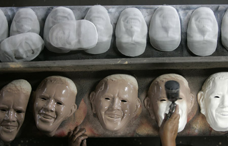 A worker puts finishing touches to masks made in the likeness of US President Barack Obama at a costume factory assembly line in a suburb of Rio de Janeiro February 10, 2009. A total of 12,000 Obama masks will be made for the upcoming 'Brazil Carnaval' festival from February 20 to 22, according to the manufacturer. [Agencies]