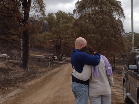A couple hugs in front of their burnt house in a town near Melbourne February 11, 2008. [Xinhua]