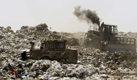 Plant equipment remove garbage at the Nezahualcoyotl dump site in Mexico City February 6, 2009. Mexico City is facing a crisis over where to put its trash -- enough to fill four sports stadiums a year -- with its sprawling dump already crammed to bursting and under a closure order. One of the world's biggest landfills, the Nezahualcoyotl dump site is a fifth the size of Manhattan and sits inside the urban sprawl of the fast-growing Mexican capital. Picture taken February 6, 2009. [Agencies]