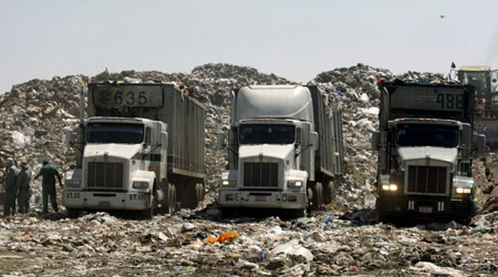 Trucks with garbage are parked at the Nezahualcoyotl dump site in Mexico City February 6, 2009. [Agencies]