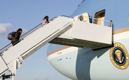 Malia (L) and Sasha Obama board Air Force One in Washington as they depart with President and first lady Obama for Chicago to spend the Presidents Day holiday weekend at their home there February 13, 2009. [Agencies]