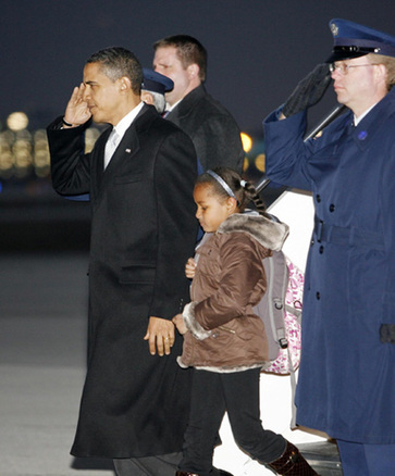 US President Barack Obama walks with his daughter Sasha as they arrive in Chicago on Air Force One to spend the Presidents Day holiday weekend at their home there February 13, 2009. [Agencies]