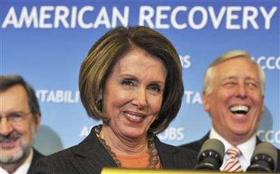 Speaker of the House Nancy Pelosi (D-CA) smiles at a news conference, following the passage in the House of Representatives of the stimulus package, on Capitol Hill in Washington February 13, 2009. [Agencies]