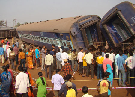 Onlookers stand beside the wreckage of a derailed train near the remote Jajpur Road station, about 120 km (75 miles) east from the eastern Indian city of Bhubaneswar, February 14, 2009. Authorities have ordered a probe into an express train derailment in Orissa that killed 15 people and injured about 160, a senior railway official said on Saturday. [Agencies]