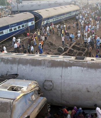 Onlookers stand beside the wreckage of a derailed train near the remote Jajpur Road station, about 120 km (75 miles) east from the eastern Indian city of Bhubaneswar, February 14, 2009. [Agencies]