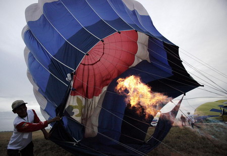A crew member holds steady a balloon as it is heated up during the 14th Philippine International Hot Air Balloon Week held at Clark airbase in the province of Pampanga, north of Manila February 15, 2009. [Agencies]