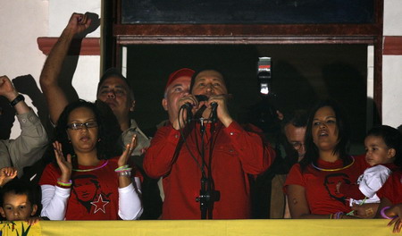 Venezuela's President Hugo Chavez celebrates with members of his government and family on a balcony of Miraflores Palace after the government announced their exit polls gave him a victory in a national referendum to decide whether to allow him to stay in power for as long as he keeps winning elections, February 15, 2009. [Agencies]