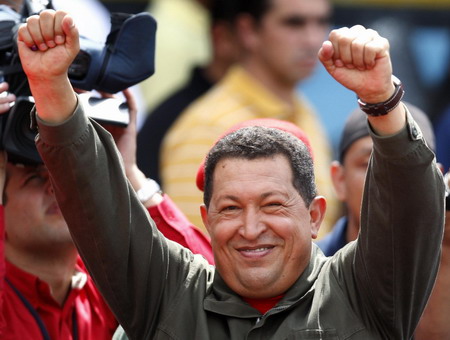 Venezuelan President Hugo Chavez greets supporters after casting during a referendum in Caracas February 15, 2009. Venezuelans [Agencies]