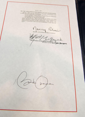 Signature of US President Barack Obama is seen on the American Recovery and Reinvestment Act Bill at the Denver Museum of Nature and Science February 17, 2009. Obama signed a $787 billion economic stimulus bill into law on Tuesday as global markets plunged on fears that the recession would deepen despite government action in many countries. [Reuters]