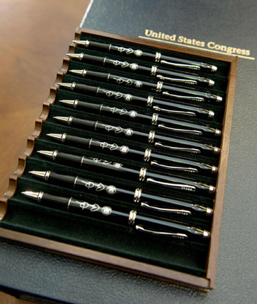 The 10 pens used by US President Barack Obama to sign the American Recovery and Reinvestment Act Bill at the Denver Museum of Nature and Science February 17, 2009. [Reuters]