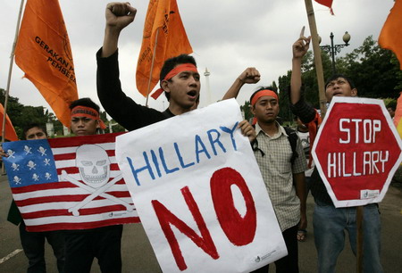 The US Secretary of State called on Tuesday for coordinated action to revive the global economy at a news conference with Japanese Foreign Minister Hirofumi Nakasone. Her visit to Indonesia is in line with Obama's desire to forge a better US relationship with the Muslim world, where many of the policies of former president George W. Bush's administration, including the 2003 US-led invasion of Iraq, were deeply unpopular. Indonesia was no exception to that, but Washington aided Jakarta in efforts to quash its own domestic militants, Bush lifted sanctions on military aid and sales imposed over human rights issues, and there was cooperation in other areas. However, while most Indonesian Muslims are moderate, the country has a small, radical fringe. About 100 Indonesians from a hardline group, Hizbut Tahrir, protested against Clinton's visit outside the US embassy in central Jakarta on Tuesday, some arguing the visit was aimed at dividing Muslims.