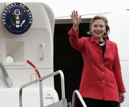US Secretary of State Hillary Clinton waves after arriving at Halim Perdana Kusuma airport in Jakarta February 18, 2009. [Reuters]