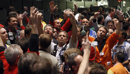 Traders in the S&P 500 pit at the Chicago Board of Trade signal orders shortly before the closing bell in Chicago, Illinois February 24, 2009. [Agencies]