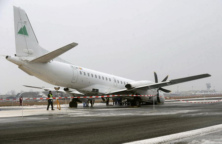 Airport workers stand around a Romanian Carpatair Saab 2000 plane following an emergency landing after developing trouble with its landing gear at "Traian Vuia" airport in Timisoara, western Romania February 28, 2009. All 47 passengers and 4 crew escaped safely.[Agencies]