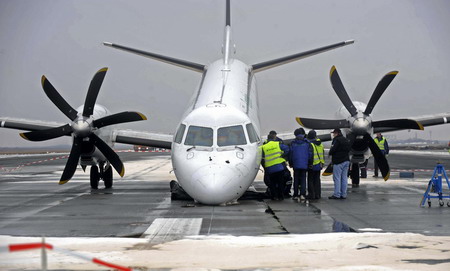 Airport workers stand around a Romanian Carpatair Saab 2000 plane following an emergency landing after developing trouble with its landing gear at "Traian Vuia" airport in Timisoara, western Romania February 28, 2009. All 47 passengers and 4 crew escaped safely.[Agencies]