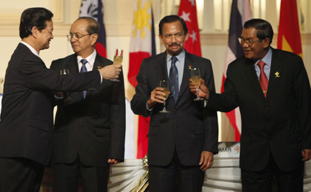 Vietnam's Prime Minister Nguyen Tan Dung, Myanmar's Prime Minister Thein Sein, Brunei's Sultan Hassanal Bolkiah and Cambodia's Prime Minister Hun Sen (L-R) raise a toast after a signing ceremony of ASEAN Summit outcome documents in the seaside resort town of Hua Hin, some 200km (125 miles) south of Bangkok, March 1, 2009. [Agencies] |