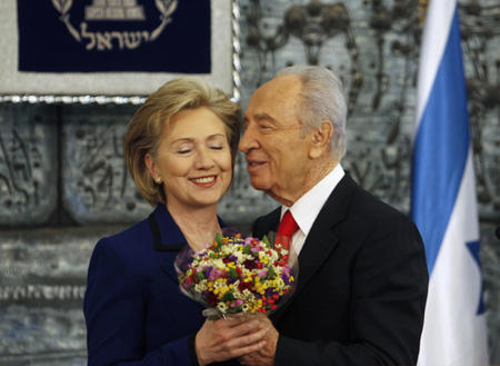Israel's President Shimon Peres (R) gives flowers to US Secretary of State Hillary Clinton after their meeting in Jerusalem March 3, 2009.[Agencies]