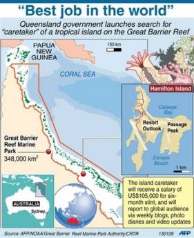 They were selected from a total of 34,684 applicants from some 200 countries hoping to become "caretaker" of Hamilton Island on the Great Barrier Reef in a tourism promotion run by the Queensland state government. The job pays 150,000 Australian dollars (US$100,000) for six months and includes free airfares from the successful candidate's home country to the island of white sands and clear waters. In return, the winner will be expected to have as much fun as possible -- soaking up the sun, swimming, snorkeling, sailing -- and report to a global audience via weekly blogs, photo diaries and video updates. Candidates had to submit a video application in English of up to one minute explaining why they are uniquely qualified for the post. "Yesterday, a team of Tourism Queensland marketing and international staff along with a professional recruitment company made the very tough decisions necessary to cut the shortlist to the Top 50," said state Tourism Minister Desley Boyle.
