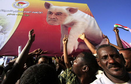 Supporters of Sudan's President Omar Hassan al-Bashir display a poster showing International Criminal Court (ICC) Chief Prosecutor Luis Moreno-Ocampo's face superimposed on a pig during a demonstration in Khartoum, against the ICC for issuing an arrest warrant for Bashir March 4, 2009. [Agencies]
