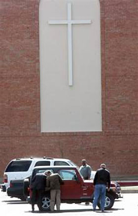 Updated: 2009-03-09 08:54 Officials look over a car outside of First Baptist Church in Maryville, Ill., March 8, 2009. A gunman walked down the aisle of a church during a Sunday service and killed the pastor, then stabbed himself and slashed two other people as parishioners wrestled him to the ground, authorities said. [Agencies] |