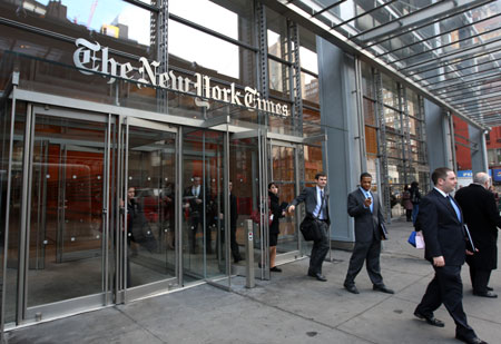 Employees walk out of the headquarters building of New York Times in Manhattan of New York, March 10, 2009. [Xinhua]