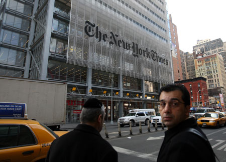 The headquarters building of New York Times is seen in this picture taken in Manhattan of New York, March 10, 2009. [Xinhua]