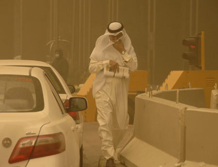 A Saudi man covers his face to protect himself from sand while walking in Riyadh March 10, 2009.[Agencies]