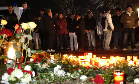 People gather at the Albertville-Realschule school where a shooting incident took place in Winnenden March 11, 2009. A 17-year old gunman went on a shooting spree at his former secondary school, the Albertville-Realschule in Winnenden in southwest Germany on Wednesday, killing up to 15 people before dying himself in a shootout with police at the car dealer, authorities said. [Agencies]