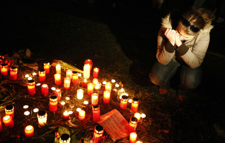 A girl mourns at the Albertville-Realschule school where a shooting incident took place in Winnenden March 11, 2009. A 17-year old gunman went on a shooting spree at his former secondary school, the Albertville-Realschule in Winnenden in southwest Germany on Wednesday, killing up to 15 people before dying himself in a shootout with police at the car dealer, authorities said. [Agencies]