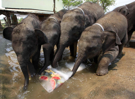 Baby elephants enjoy blocks of ice containing frozen fruit during Thailand's National Elephant Day at Ayutthaya Elephant Palace & Royal Kraal, 80 km (50 miles) north of Bangkok, March 13, 2009. [Agencies]