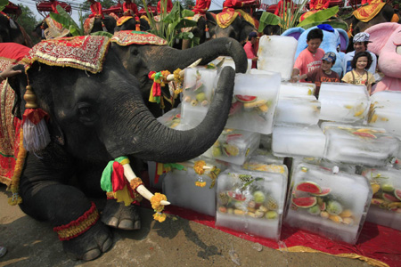 Elephants enjoy a block of ice containing frozen fruit during Thailand's National Elephant day at Ayutthaya Elephant Palace & Royal Kraal, 80 km (50 miles) north of Bangkok, March 13, 2009. [Agencies]