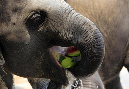 A two-month-old elephant enjoys a block of ice containing fruit during Thailand's National Elephant Day at Ayutthaya Elephant Palace & Royal Kraal, 80 km (50 miles) north of Bangkok, March 13, 2009. [Agencies]