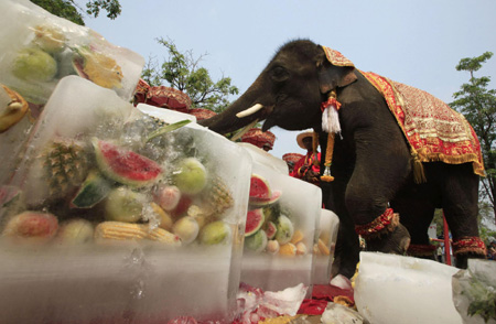 An elephant plays with a block of ice containing fruit during Thailand's National Elephant Day at Ayutthaya Elephant Palace & Royal Kraal, 80 km (50 miles) north of Bangkok, March 13, 2009. [Agencies]