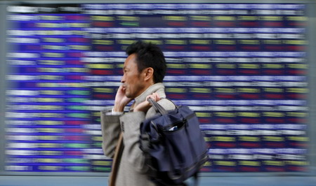 A man walks past a stock index board outside a brokerage in Tokyo March 11, 2009. [Agencies]