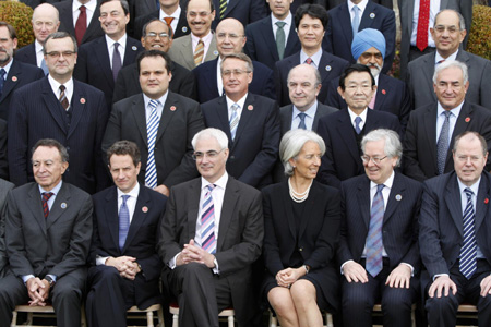 Finance ministers, central bank governors and heads of institutions pose for a family photograph during a break in the G20 Finance Ministers meeting at a hotel, near Horsham, in southern England March 14, 2009. [Agencies]