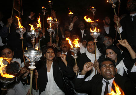 ![]() Pakistani lawyers hold torches as they march during a countrywide anti-government protest rally in Lahore March 14, 2009. [Agencies]