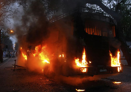 A bus burnt by protesters is seen during an anti-government protest march in Lahore March 15, 2009. [Agencies] Pakistan's sacked chief justice to be restored