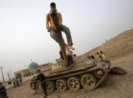 A man sits on a turret of a tank while visiting a war memorial site near the Iraqi border, 1,365 km (854 miles) southwest of Tehran in Khoozestan province, March 16, 2009. [Agencies]