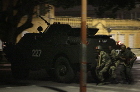 Soldiers are seen after two tanks, backed by troops, forced their way into a presidential palace in Antananarivo March 16, 2009. [Agencies]