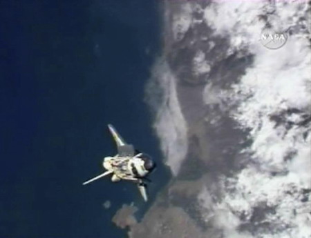 The Space Shuttle Discovery performs a rendezvous pitch maneuver prior to docking with the International Space Station in this image from NASA TV March 17, 2009. [Agencies]