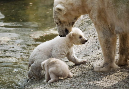 Two newborn polar bear cubs play near the water beside their mother Huggies on their first day out at the Ouwehands Zoo in Rhenen March 17, 2009. The polar bear twins were born December 14, 2008. [Agencies]