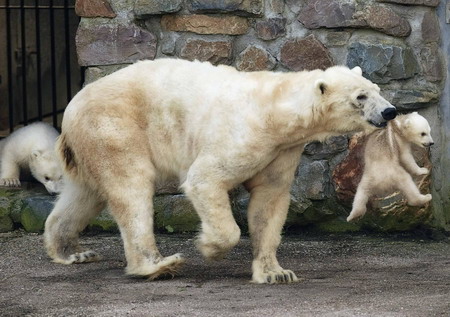 One of the two newborn polar bear cubs is held by his mother Huggies, on their first day out at the Ouwehands Zoo in Rhenen March 17, 2009. The polar bear twins were born December 14, 2008. [Agencies]