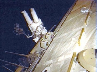 Their first task was to bolt a girder onto the space station's structure. Known as S6, the girder holds a pair of panels that will form the orbiting outpost's fourth and last solar antenna. The 14-ton piece was carried into space by Discovery, which was launched Sunday from Florida. The orbiter's robotic arm was used to lift it out of the shuttle's bay. The solar panels, which measure 35 meters (yards) by 11.58 meters (yards) when deployed, contain 32,800 cells that convert the light of the sun into electricity. They will provide the power the space station needs to carry out scientific experiments programmed by the European Columbus laboratory and the Japanese Kibo laboratory. Once Swanson and Arnold finish bolting on S6, they will make the electrical and climatization connections necessary to activate the antenna. The space walk was expected to last six and a half hours. NASA dropped a fourth space walk from the mission schedule and shortened the shuttle flight by a day to 13 days after Discovery's launch was pushed back from March 11 to 15. The delay was due to the discovery of a hydrogen leak from the fueling system for the external fuel tank just hours before the March 11 launch. In all, NASA has scheduled nine shuttle flights through 2010 to complete the construction of the space station, a 100-billion-dollar project backed by 16 countries. Upcoming shuttle flights also include the last mission to service the orbiting Hubble telescope in May. |