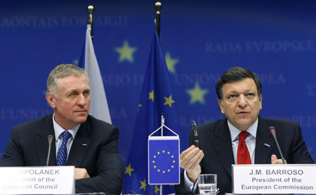 Czech Prime Minister Marek Topolanek, whose country holds the EU presidency, confirmed the sum at a press conference at the end of a two-day summit, which focused on economic issues amid worsening financial and economic crisis. "Europe is showing it's up to the challenge," European Commission President Jose Manuel Barroso echoed him on the matter at the same occasion. They also reached an agreement to double the EU's medium-term financial aid, or crisis fund, to 50 billion euros (US$68 billion) to help Central and Eastern member states out of their financial crunch. Topolanek said the money was earmarked for non-euro zone EU member states, which have been hit hard by the global financial crisis. The European Commission raised the crisis fund from 12 billion euros (US$16.32 billion) to 25 billion euros (US$ 34 billion) in December 2008, when Hungary and Latvia received a total of 9.6 billion euros (US$13.06 billion). More countries are expected to ask for such assistance, with Romania the next, as Central and Eastern European countries suffered even more from the crisis than their Western neighbors. |