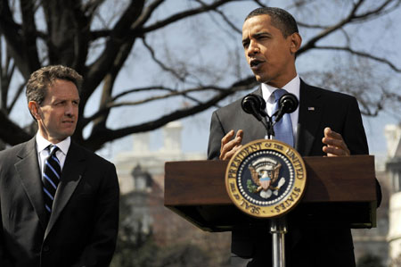 Geithner has been under fire over his failure to block at least $165 million, and possibly as much as $218 million, in bonuses paid out to employees of insurer American International Group, which has received billions in government aid. With public outrage over the AIG bonus scandal mounting and several lawmakers calling for Geithner's resignation, Obama was forced this week to repeatedly defend his treasury secretary, saying he had his complete confidence. While Obama has said Geithner's job is safe, some Washington pundits have noted it is not a good sign that the president has had to say it, and so often. The odds on whether Geithner will leave by the end of June increased over the last week in the Intrade political prediction market, although traders still gave it only a small chance of happening. Obama stressed in the "60 Minutes" interview, which will be broadcast on Sunday, that neither he nor Geithner had discussed the possibility of his quitting, CBS said in a statement on Saturday. Geithner said this week he took full responsibility for the controversy surrounding the AIG bonuses and dismissed calls for his resignation, saying it "just comes with the job." Geithner, who has been in his job less than two months, has also faced criticism over his slow roll-out of plans to save the banking sector, which Obama said this week was key to staving off further financial calamity. Toxic Assets A source familiar with the bank bailout plan said on Saturday the Treasury Department would unveil a program next week aimed at cleansing toxic assets from bank balance sheets that have frozen up lending and fueled the recession. The keenly awaited plan proposes setting up an entity the Federal Deposit Insurance Corp will use to offer low-interest loans to private interests for buying up banks' soured assets, many of which are tied to mortgages and have tumbled in value. |