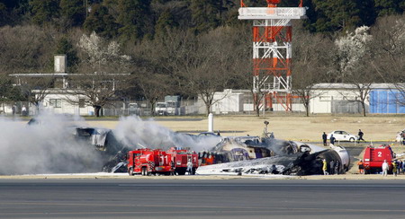 A cargo plane burns on the tarmac at Narita international airport in Chiba, Japan March 23, 2009. [Agencies]